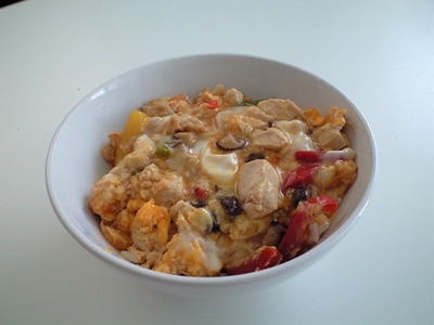 鶏胸肉としいたけとパプリカ3種で、カラフル親子丼を作りました。