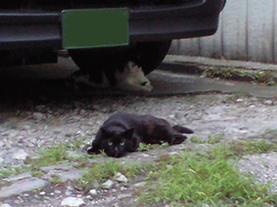 (奥の三毛が主犯、手前の黒は見張り兼ボディーガードです)